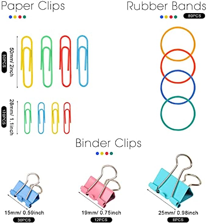 Efficient File Arrangement: various sizes, different binder clips, paper clips, and rubber bands, multi-colors, suitable for different thickness, type, scene of information annotation and file arrangement, let you more relaxed and interested in the process of work.
