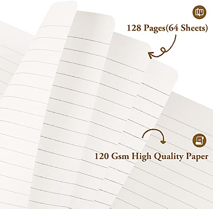 PREMIUM THICK PAPER NOTEPAD – 128 Pages (64 Sheets) 120Gsm thick lined paper, which is 35% thicker than normal. Suit for most pen types, ballpoint pens, brush pens, fineliner pens, glitter pens, EXCEPT Alcohol-based Markers. The paper resists damage from light and air and the paper protects your eyes from irritation. Lines width 6mm. Size: 5"X8.25", Perfect size for carrying around or put into your bag or purse.