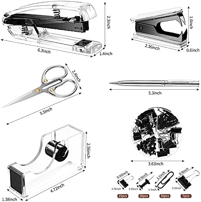 Thoughtful design: there is a non-slip mat on the bottom of the stapler; The stapler is about 6.2 x 2.3 x 2.3 inch, tape dispenser is about 4.7 x 2.7 x 1.2 inch, the staple remover is about 2.3 x 1.6 x 0.4 inch, the scissor is about 5.5 x 2.4 inch, the pen is about 5.3 inch; They can be put in the drawer at will, will not take up space; The clip is equipped with a lattice storage box for easy storage; You can put them in your handbag or schoolbag and take them with you anywhere