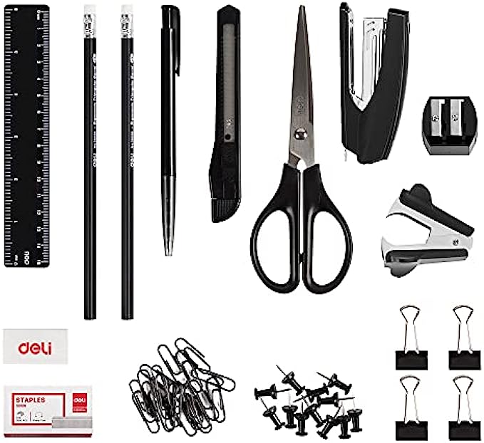 Comes with:1x Rotating desk organizer, 1x stapler, 1 x staple remover, 1x scissors, 1 x Sharpener, 1 x small cutter, 1 x ruler, 1 x eraser, 1 x ball pens, 2 x HB pencils, 4 x binder clips, 10 x push pins, 20 x paper clips, 1000 x staples.